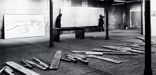 Aufbau der Ausstellung Alles Schwindel? 1980. Arbeiten von Arno Strutz, Wolfgang Finck, Heinz Erich Gödecke und Jan Meyer-Rogge